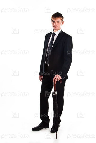Молодой, респектабельный и успешный бизнесмен в темном деловом костюме с зонтом