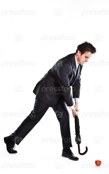 Молодой, респектабельный и успешный бизнесмен в темном деловом костюме с зонтом