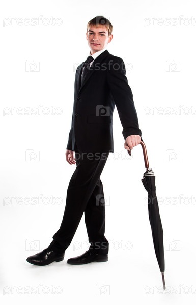 Молодой, респектабельный и успешный бизнесмен в темном деловом костюме с зонтом
