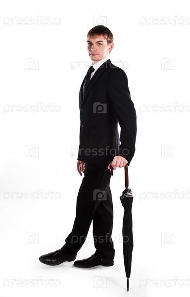 Молодой, респектабельный и успешный бизнесмен в темном деловом костюме с зонтом