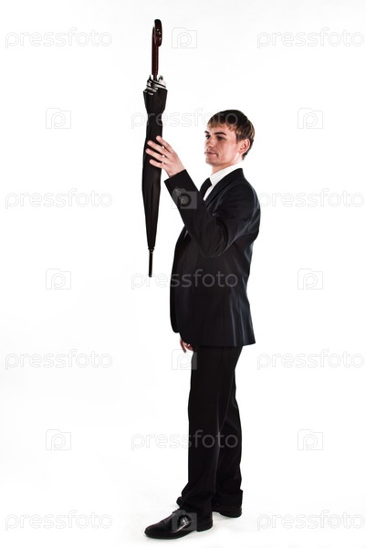 Молодой, респектабельный и успешный бизнесмен в темном деловом костюме с зонтом
