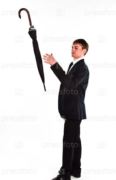 Молодой, респектабельный и успешный бизнесмен в темном деловом костюме с зонтом