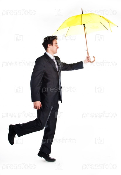 Молодой, респектабельный и успешный бизнесмен в темном деловом костюме с зонтом