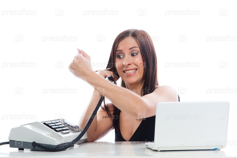 Молодая и красивая девушка-секретарь со старым телефоном и белым ноутбуком работает, сидя за столом в офисе