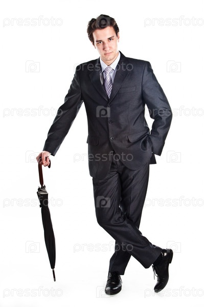 Молодой, респектабельный и успешный бизнесмен в темном деловом костюме с зонтом