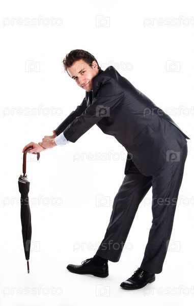 Молодой, респектабельный и успешный бизнесмен в темном деловом костюме с зонтом