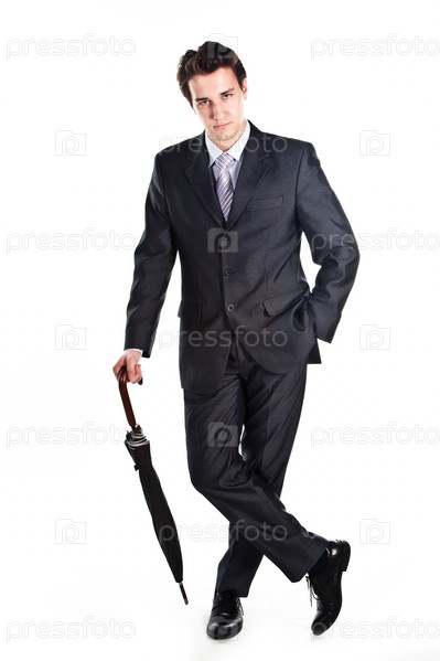 Молодой, респектабельный и успешный бизнесмен в темном деловом костюме с зонтом