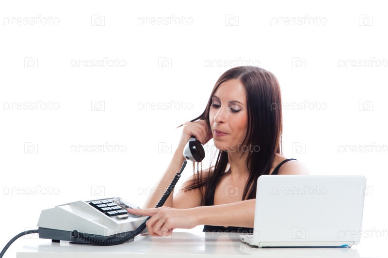 Молодая и красивая девушка-секретарь со старым телефоном и белым ноутбуком работает, сидя за столом в офисе