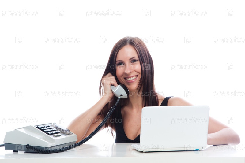 Молодая и красивая девушка-секретарь со старым телефоном и белым ноутбуком работает, сидя за столом в офисе