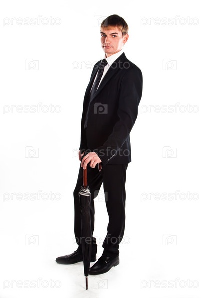 Молодой, респектабельный и успешный бизнесмен в темном деловом костюме с зонтом