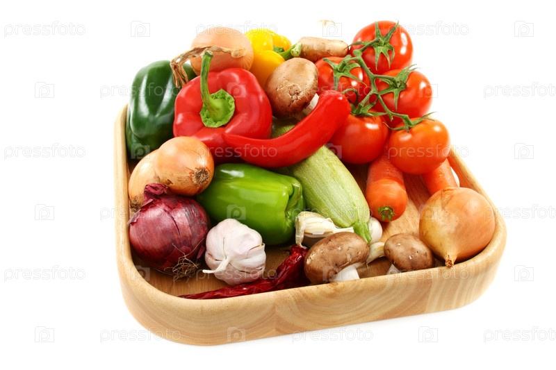 Овощи для супа на деревянном подносе на белом фоне
