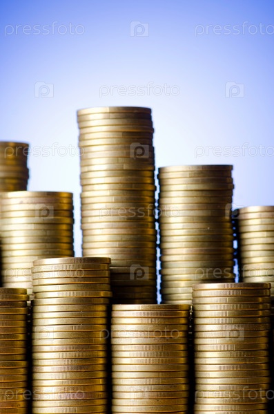 Золотые монеты в высоких стопках