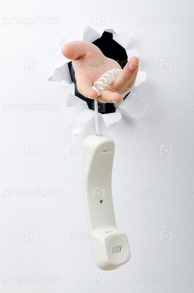 Рука телефонной трубкой через отверстие в бумаге