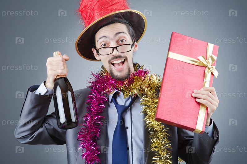 Человек в деловом костюме встречает Новый год