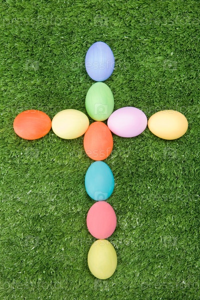 Изображение креста, сделанного из пасхальных яиц на зеленой траве