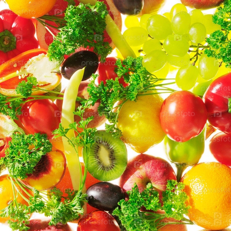 Свежие фрукты и овощи, изолированные на белом фоне