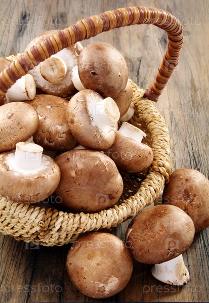 Свежие грибы в корзине на деревянном столе
