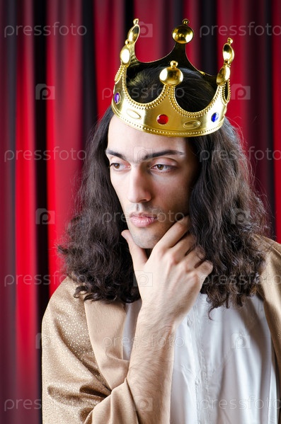 Задумчивый молодой человек с короной на голове на фоне красного занавеса