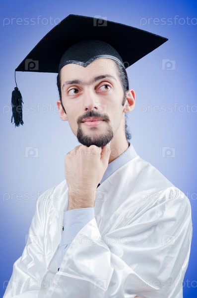 Молодой мужчина в академической шапочке на голубом фоне