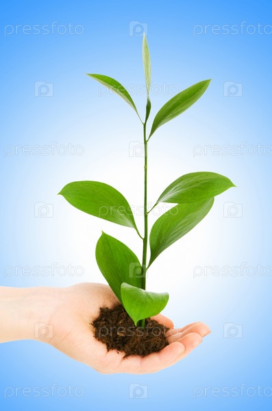 Зеленая рассада в руке на голубом фоне