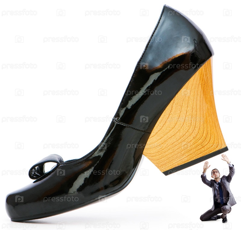 Черная женская туфля и маленький мужчина под каблуком на белом фоне