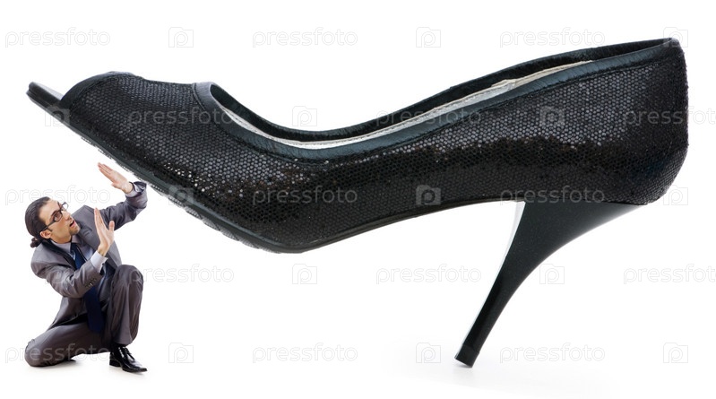 Черная женская туфля и маленький мужчина под ней на белом фоне