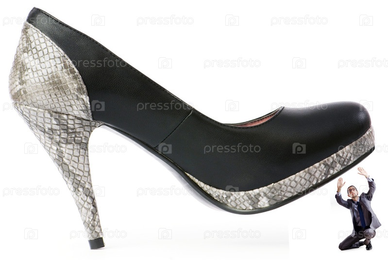 Черная женская туфля и маленький мужчина под каблуком на белом фоне