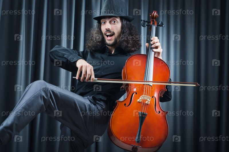 Молодой мужчина играет на виолончели на фоне занавеса