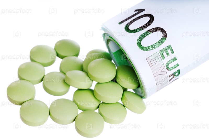 Зеленые таблетки и купюры евро на белом фоне