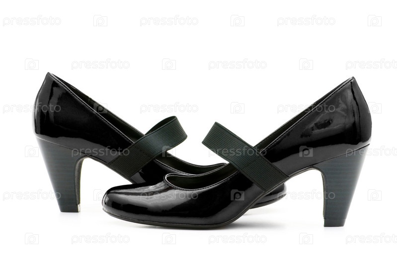 Пара черных женских туфель на белом фоне