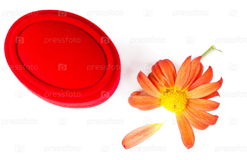 Красный коробок и цветок хризантемы на белом фоне