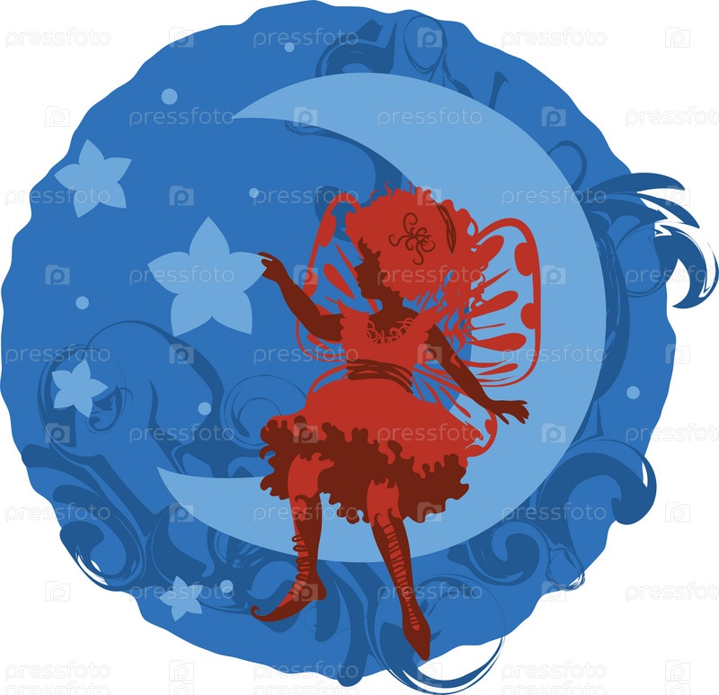 Красная фея на сидит на голубой луне, иллюстрация