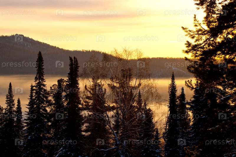 Закат в зимнем хвойном лесу