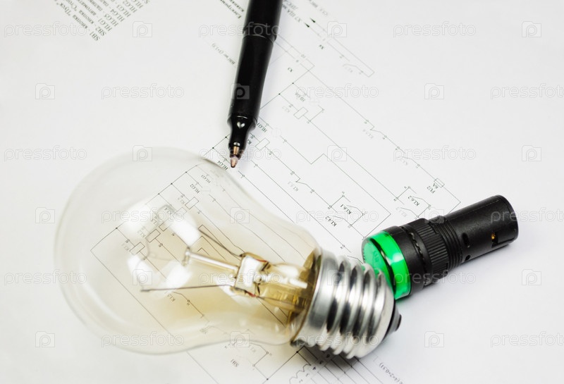 Карандаш, лампочка и светодиодный индикатор на схеме проводки