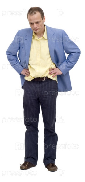 Взволнованный мужчина в синем пиджаке стоит на белом фоне