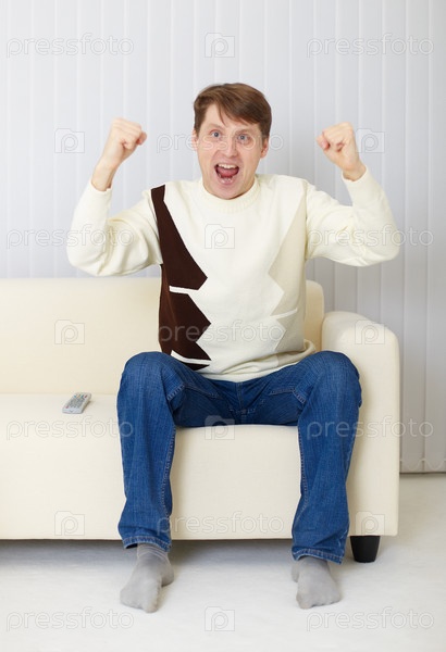 Человек, сидящий дома на диване и смотрящий телевизор - фанат