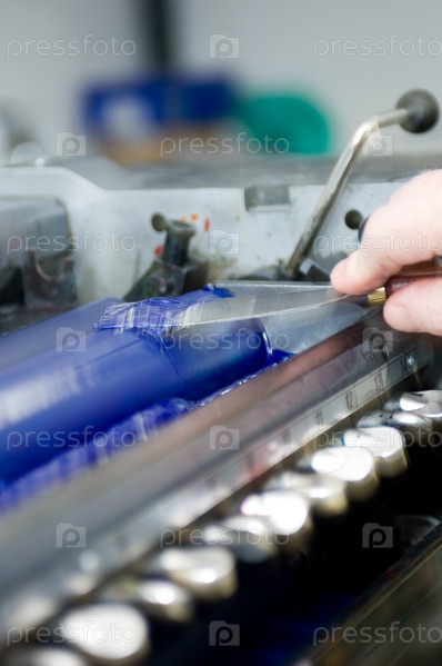 Рука наносит кистью синюю краску на оборудование для полноцветной печати