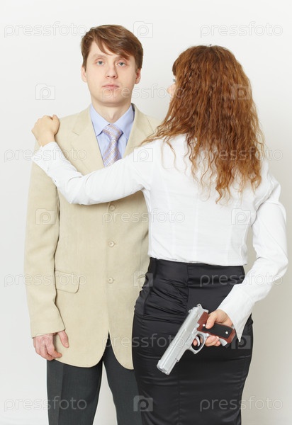 Пара молодых людей - женщина с пистолетом в спине и мужчина