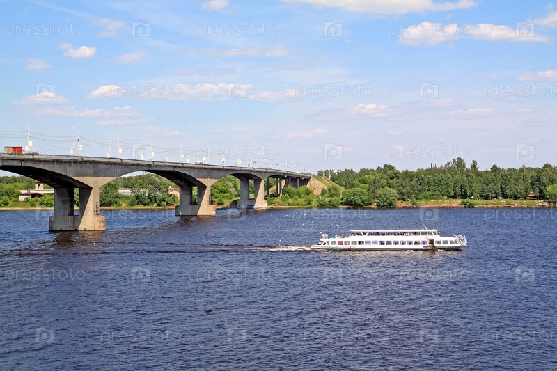 Теплоход плывет по реке вблизи моста