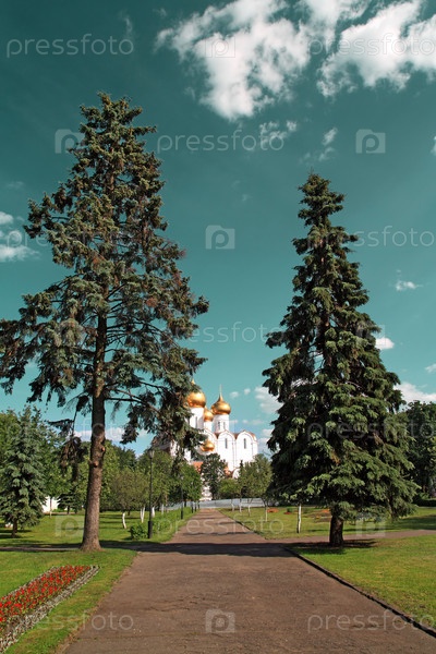 Аллея в парке, ведущая к православной церкви