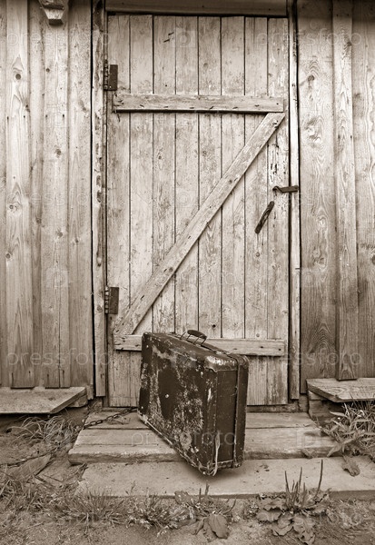 Старый чемодан у двери старого деревянного дома, сепия