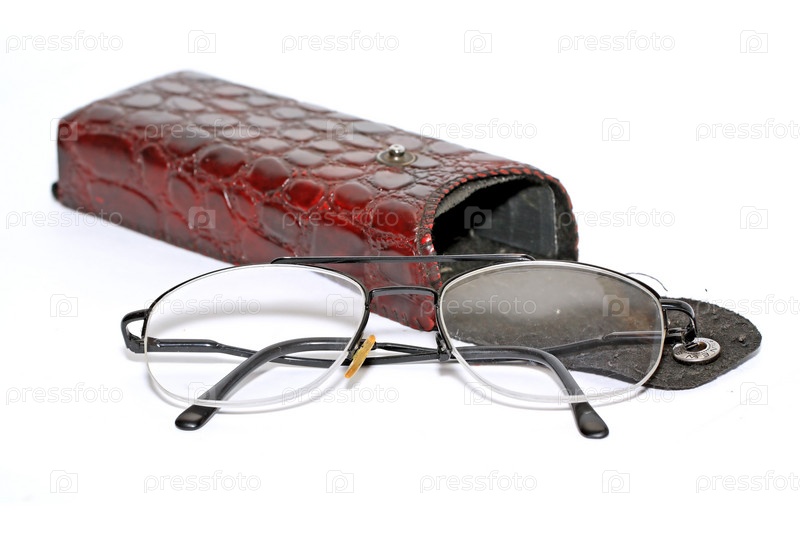 Очки с кожаным футляром на белом фоне