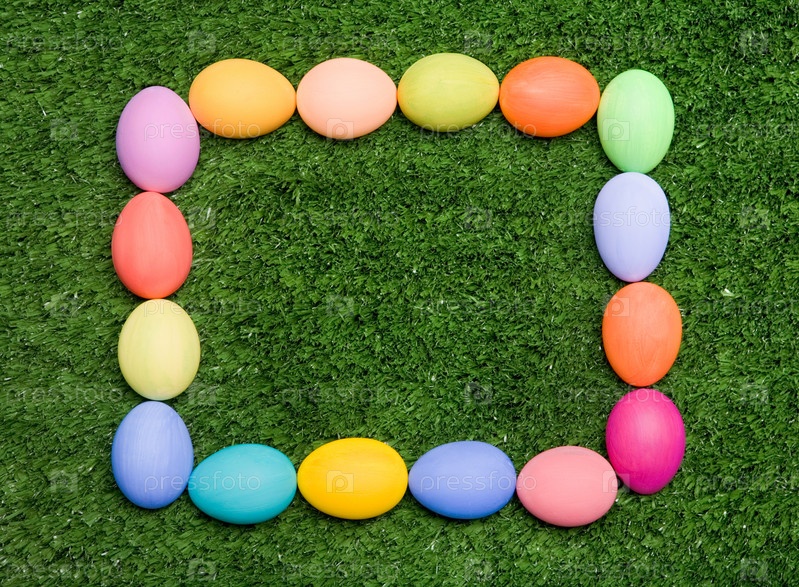 Изображение многоцветных яиц, образующих квадрат над зеленой травой
