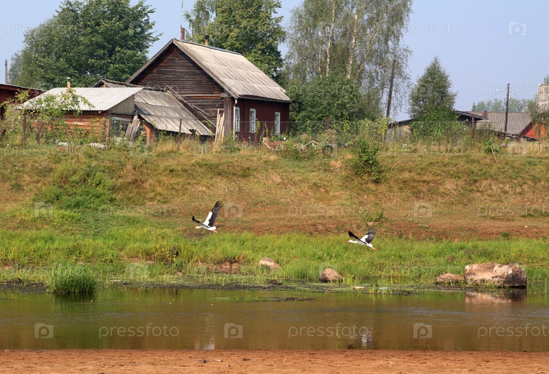 Два летящих журавля над рекой в сельской местности