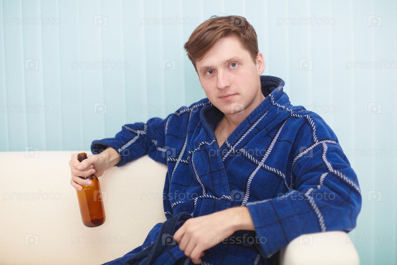 Молодой человек в халате сидит дома на диване с бутылкой пива