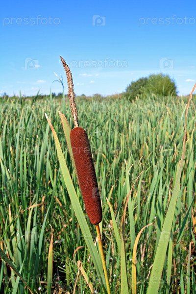 Красный камыш среди зеленой травы