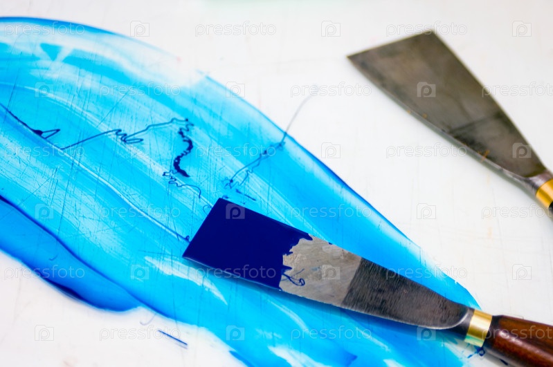 Специальные шпатели и синяя краска для полноцветной печати на белом фоне