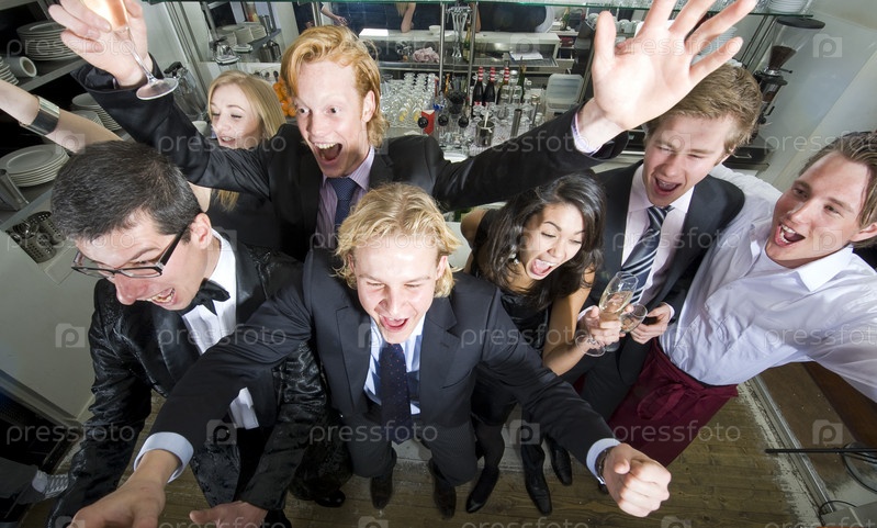 Посетители вместе с персоналом ресторана празднуют успех