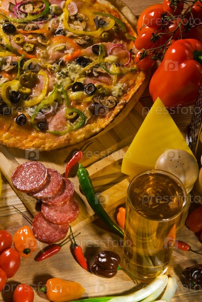 Пицца, колбаса, сыр и овощи на столе