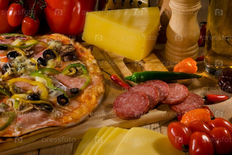 Пицца, колбаса, сыр и овощи на столе